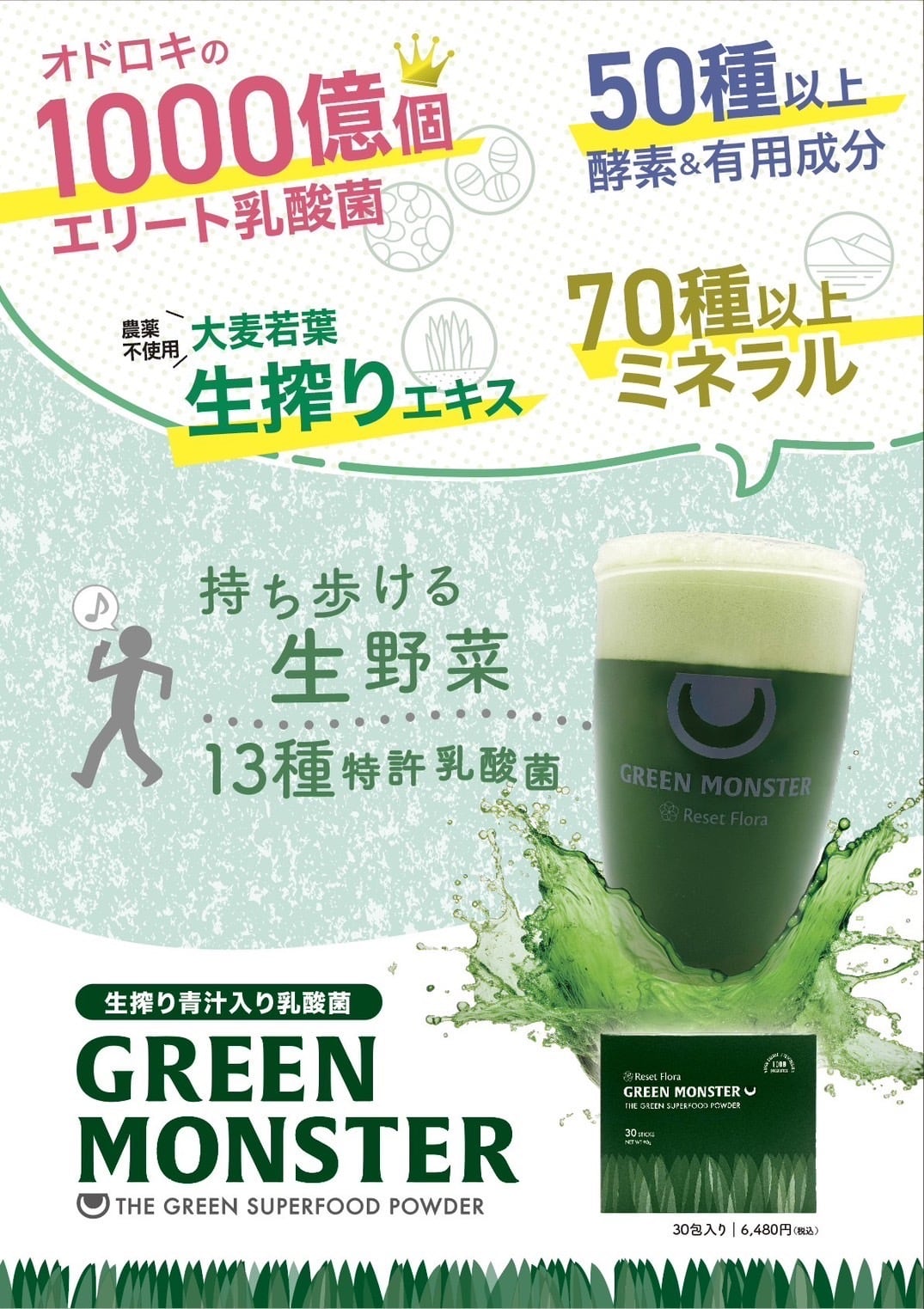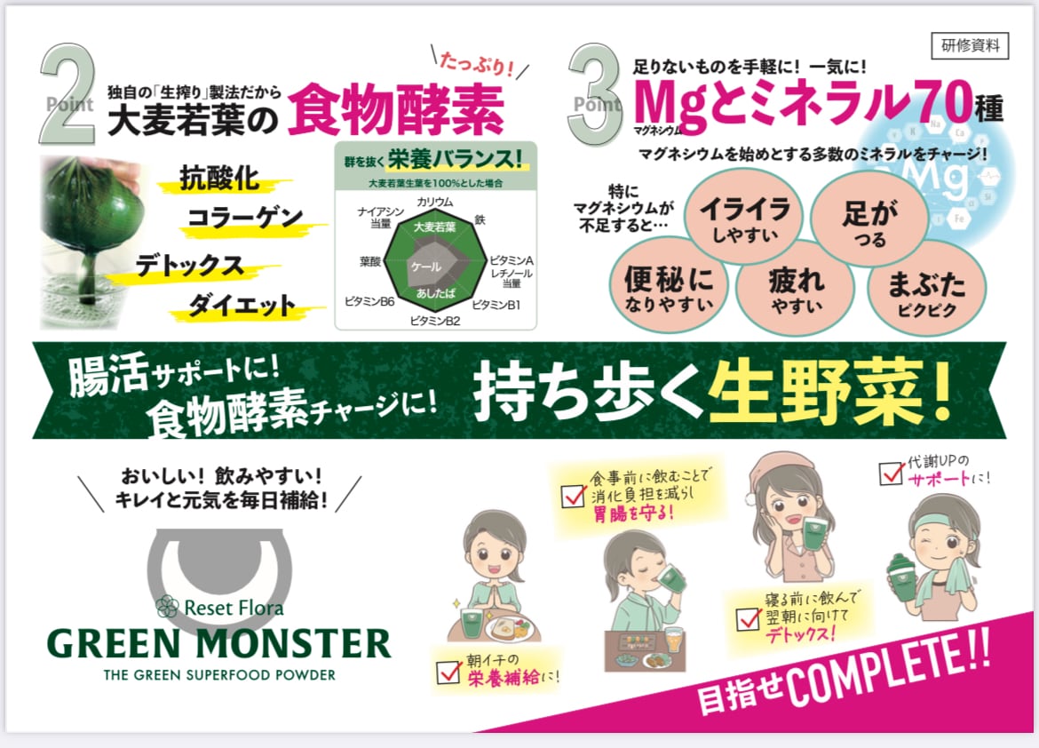 大麦若葉エキス(大麦若葉(大分県産)、デキストリン)、デキストリン、イソマルトオリゴ糖粉あめ、乳酸菌粉(卵を含む)、イオン化湖水ミネラル末)